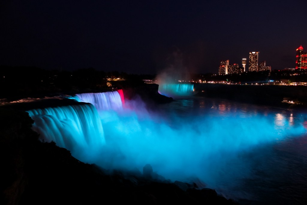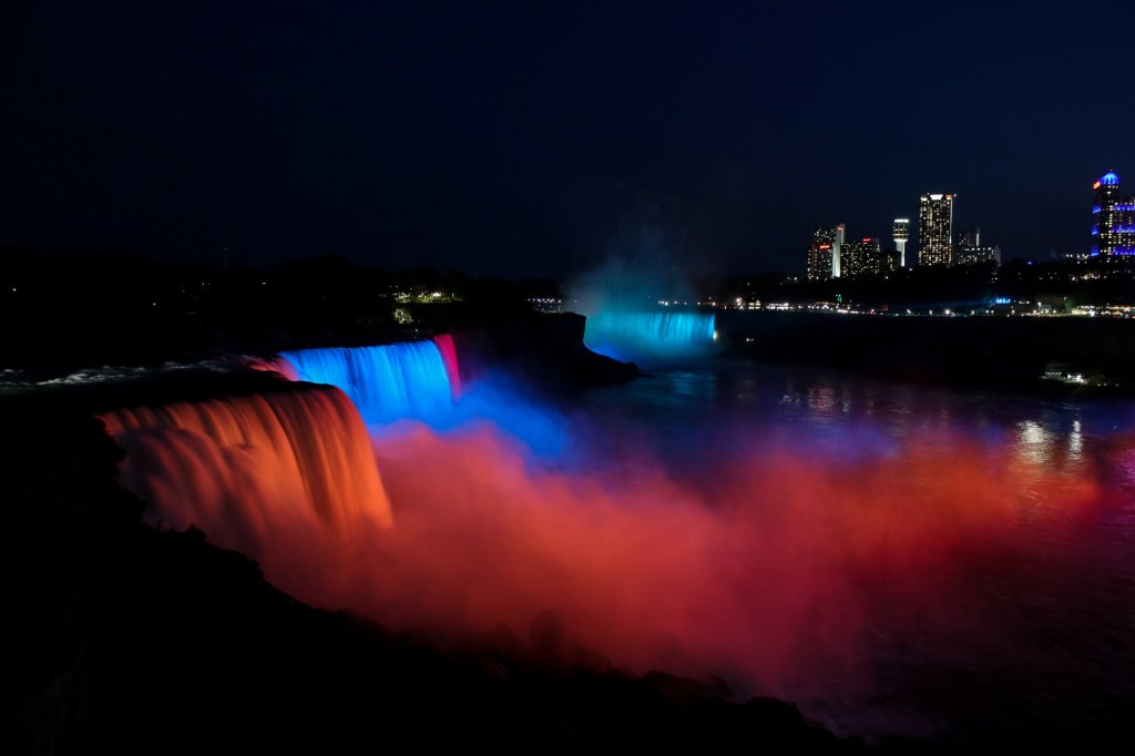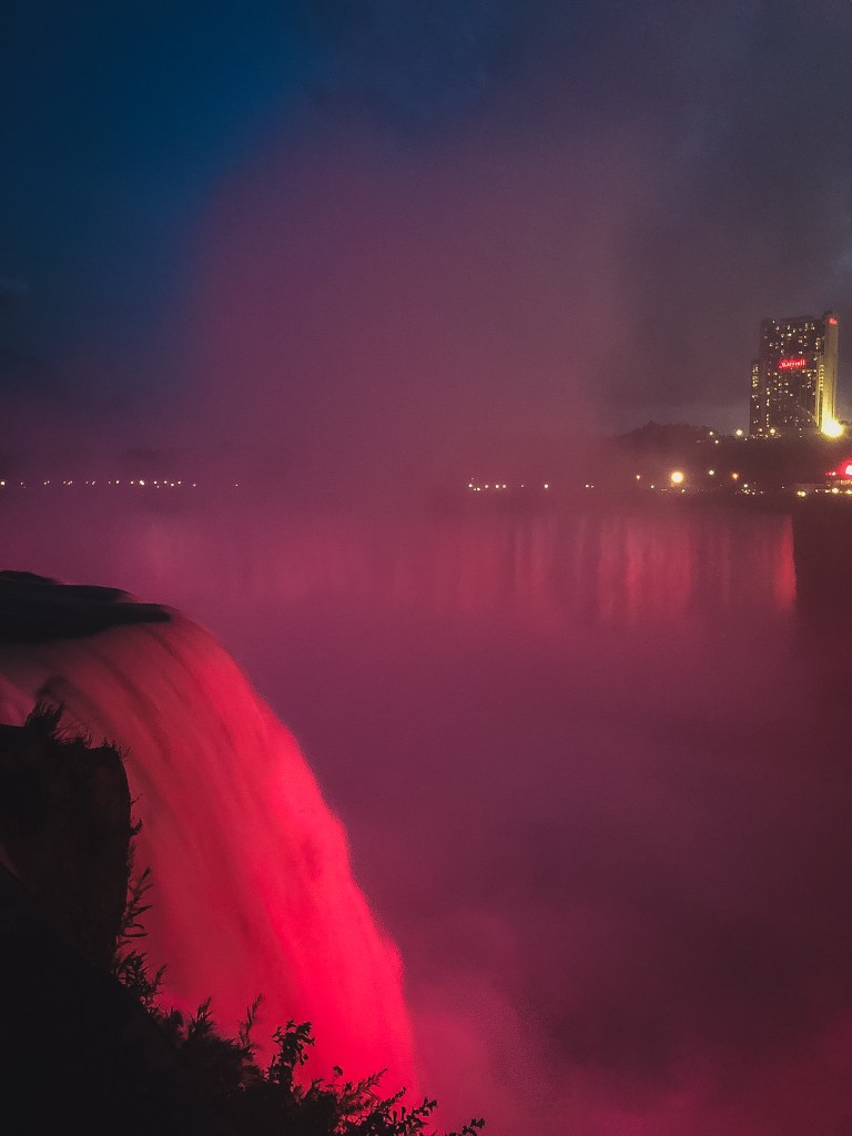 It got dark shortly after arriving, but that’s part of the fun! Every night, they light up the falls and it’s an incredible sight! We admired the view of Bridal Veil and American Falls from Goat Island, then walked back across the pedestrian bridge to the observation deck. The observation deck is pretty crowded at night, but if you wait for a spot long enough, people cycle through. The view of Bridal Veil and American Falls is incredible from the observation deck (red and dark blue in the photo below). NOTE: The times of attractions varies depending on the time of year. Please make sure you check when things are open/closed before you visit! When we visited, fireworks went off nightly at 10pm. After looking at the colored falls, we stayed for the fireworks. I’d say the observation deck is definitely the best place to view them. After the fireworks, we walked back to our hotel (less than a mile) and called it a night.
