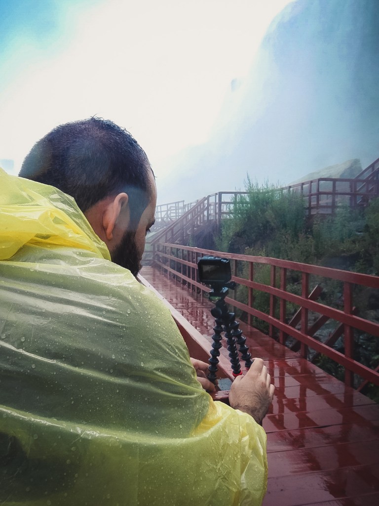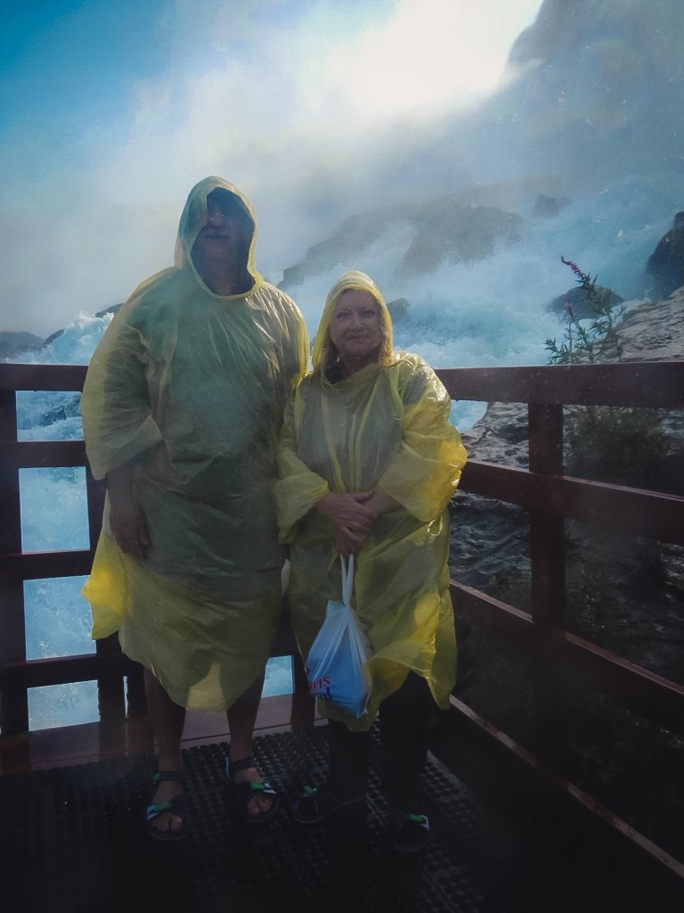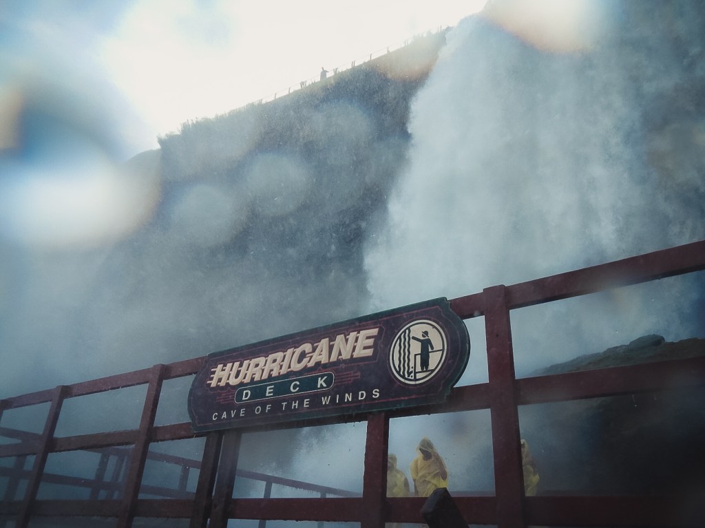You receive a timed ticket for Cave of the Winds, so if there’s a crowd, you may end up having to kill a few hours before you can enter. We arrived at 8:30am (it opened at 9am) and walked straight in. No waiting at all! I highly recommend arriving right when they open. When you enter, you watch a very impressive 5-minute video about the history of the falls before heading to get your gear. At Cave of the Winds, you receive a poncho and sandals. Honestly, I did not get as wet as I thought I would! I fully anticipated having to go back to the hotel and change, but I stayed pretty dry! The hardest part was that the hood of the poncho kept blowing off due to the force of the wind! I had another waterproof jacket on underneath to help with that, but ultimately, I would have been fine without it. We had a waterproof camera and a GoPro to take photos with.