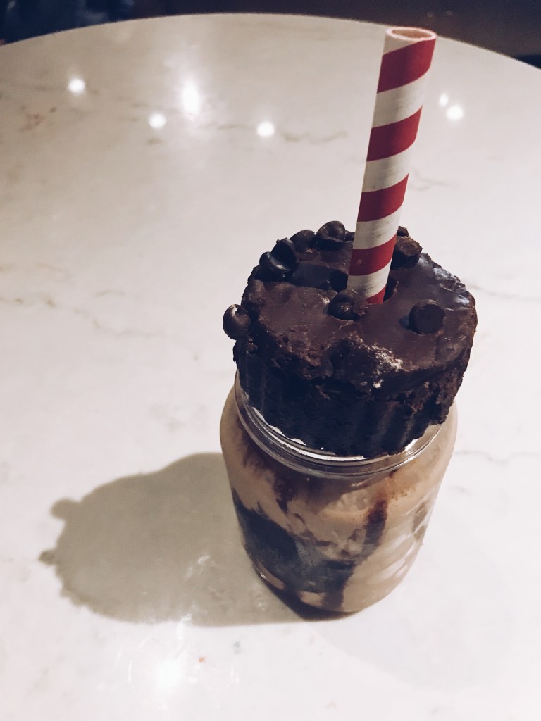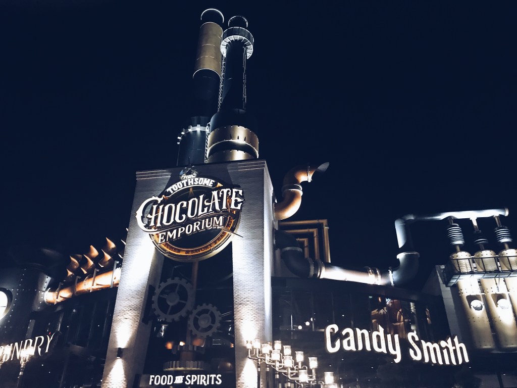 Or, you could hit one final place – Toothsome Chocolate Emporium. By now, you’ve seen the huge Toothsome Chocolate Emporium factory looming across the river several times. It was probably close to 10:30pm and my brother and I decided to stop for one final sweet treat. You can choose to sit down for dinner, or order from their quick service dessert counter. It was PACKED in there, but I was super impressed with how fast the dessert counter was able to crank out everyone’s orders! The space for taking photos was very limited, unfortunately, but take my word for it – this dessert put me in a coma of sugary delight.