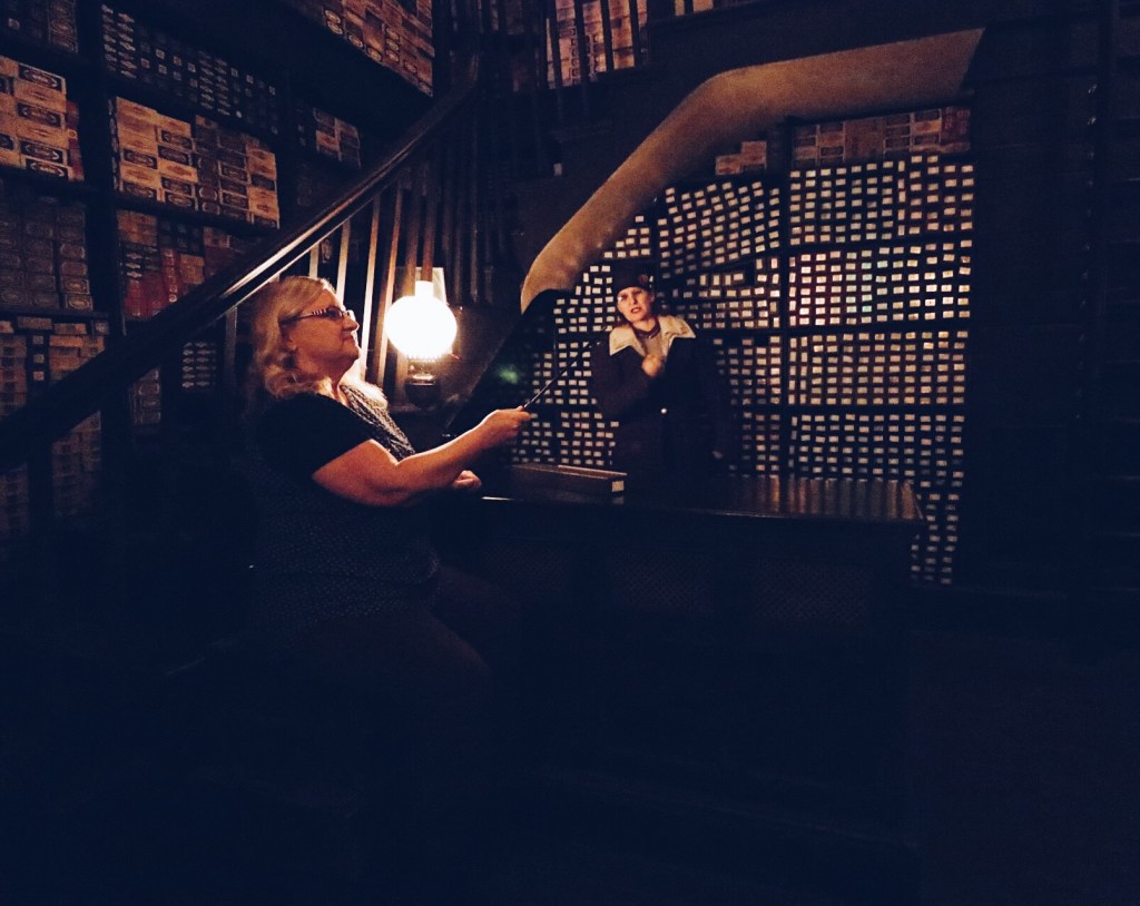 In Diagon Alley, my brother went on Escape from Gringotts on his own first to scope it out for me. While we waited, we went to Ollivander’s Wand Shop and watched the little show they put on there. They choose one person to “test wands on” and it turned out to be my mom! It was so fun to watch her in the show. By the time we were done at Ollivander’s, my brother was done on the ride. It was probably around 9:30am or so, so the park had just opened to the public. With my brother’s encouragement, we went on the ride together and only waited for about 25 minutes.