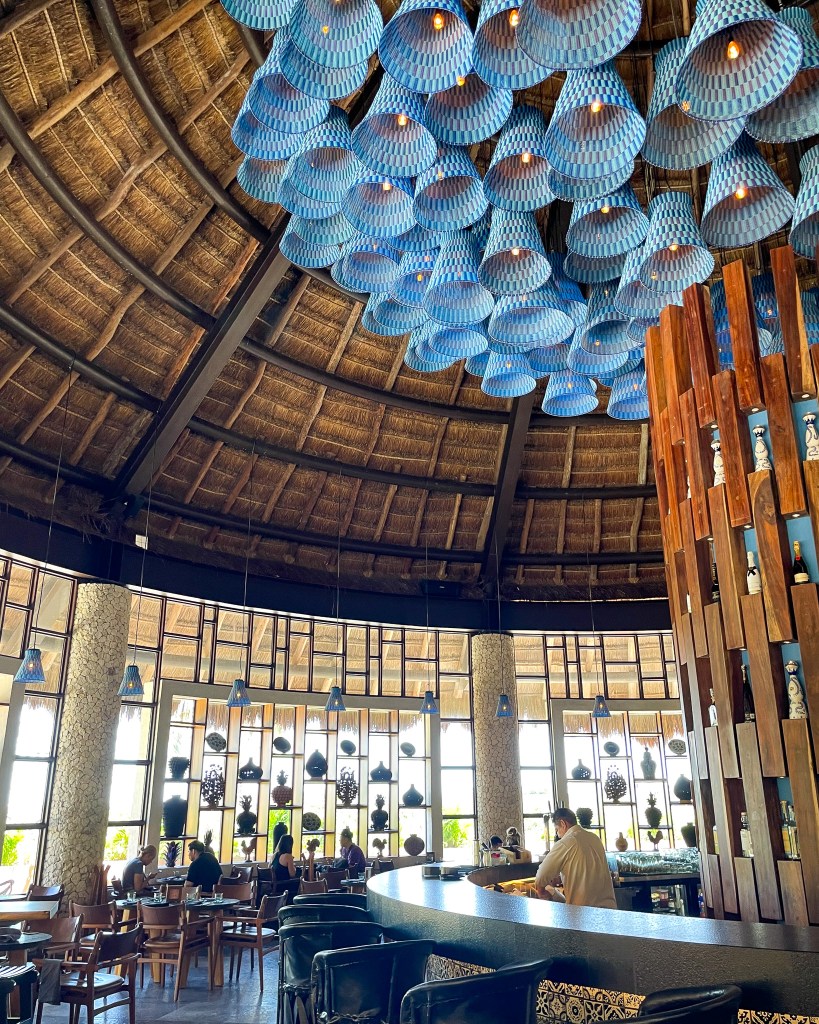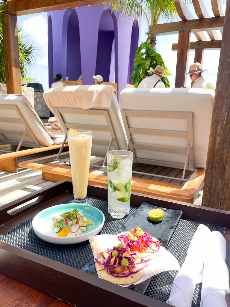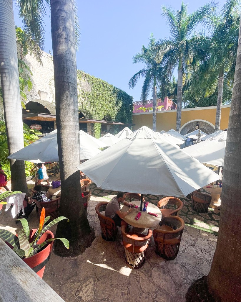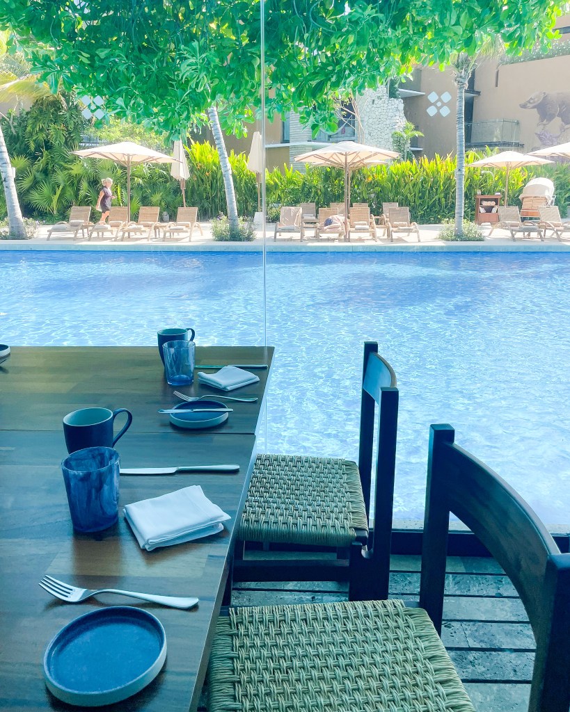 To start our full resort day, we ate breakfast at Cayuco, which had amazing views of the pool. It’s a buffet with plenty of Mexican and American food options. We then lounged in the shade by the swim up bar for the rest of the day. We took a break to eat lunch at the Mercado and then went back to our loungers.
