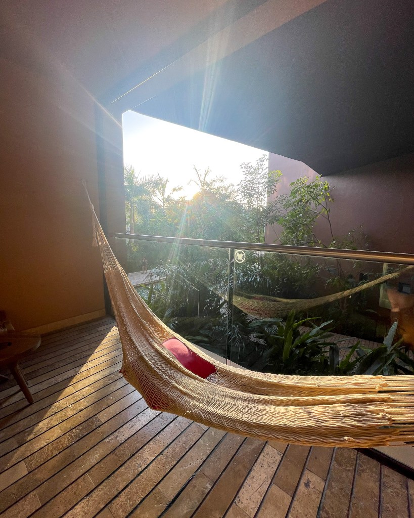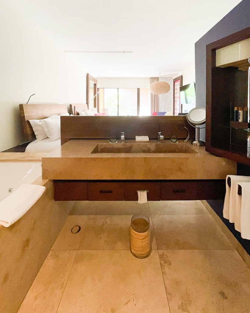 After the pool, we checked into our rooms, called the extension to get our luggage brought up to our room, and showered for dinner. The hotel room was amazing. We literally picked the cheapest room (Garden View) and it was perfect. It had a patio with a hammock, seating and dining area, and a huge bathroom. The tub in the middle of the room was a little weird… Everything in the mini fridge is included and restocked daily! We mostly drank all the waters.