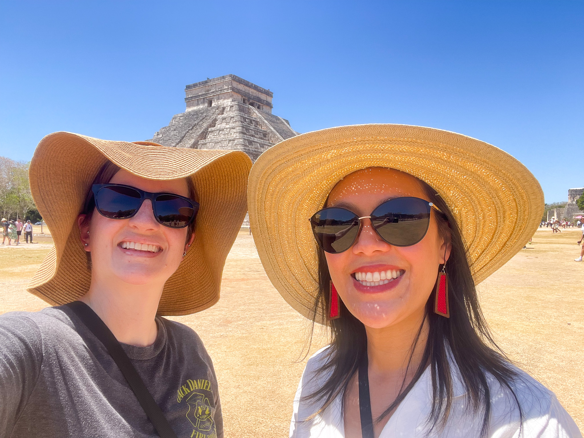 I wore athletic clothing on the tour, and brought my swimsuit in another bag for the cenote (the hotel rooms had a little canvas bag I used, luckily!). I was grateful for my tennis shoes because of all the dirt and dust, but the walking isn’t strenuous at Chichen Itza. You could pretty much wear whatever you want that’s comfortable, but you must prepare for the SUN. Next time I go, I’ll be wearing a long sleeve sun guard-type shirt. The tour group will give you a water bottle, so be sure to drink up! Definitely bring a hat that covers your neck and your sunglasses. Embrace the tourist look – EVERYONE there is a tourist anyway, might as well be comfortable.