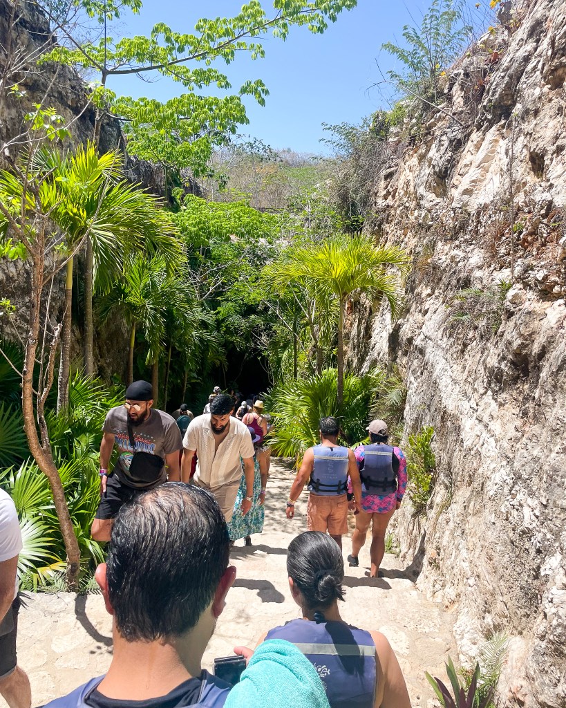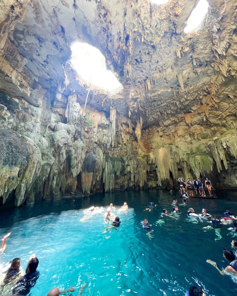 After Chichen Itza, we drove to the Tsukan cenote. Ok… thoughts on the cenote… In my head, I pictured a quiet, calming cave pool where I could sit and relax (like what’s depicted on their instagram). In reality, it was chaotic. Tsukan IS a beautiful cave pool! It is also a very popular destination and there were many families and children all trying change, get life vests, walk down the stairs, and enter the cenote through one small entrance.