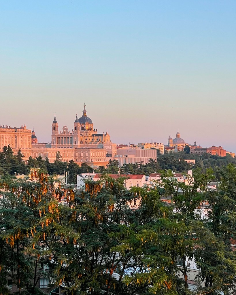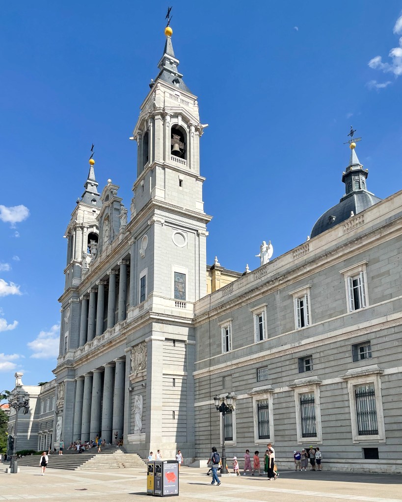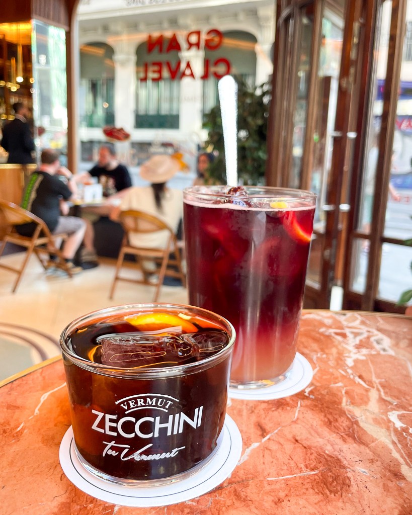 We then walked down Gran Via. This is a super popular street with lots of shopping and food. It reminded me of New York City – huge buildings, huge billboards, lots of hub-bub. We didn’t do any shopping, but we did stop for drinks at Vermuteria Gran Clavel and I enjoyed one of the best vermuts of our trip! I highly recommend this spot. After our quick beverage break, we cut off of Gran Via and detoured to see the Palacio Real de Madrid. The views from the front plaza area are incredible!