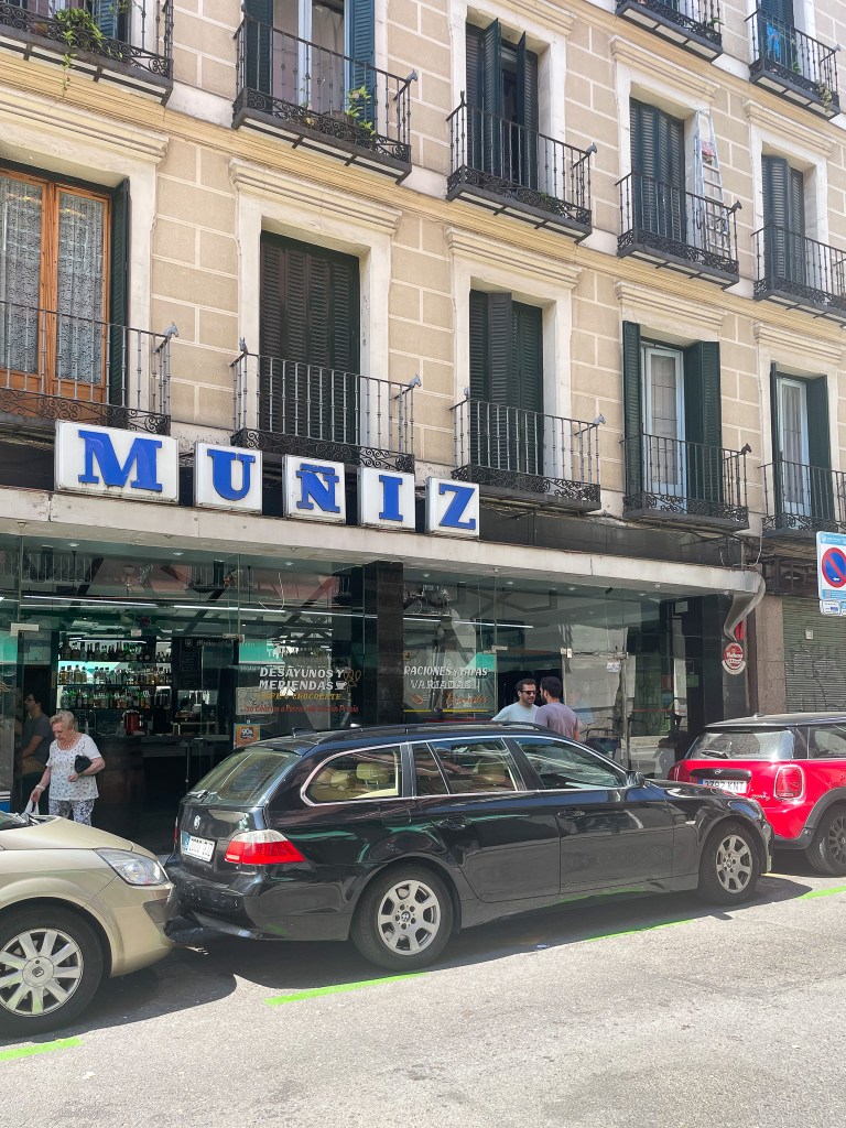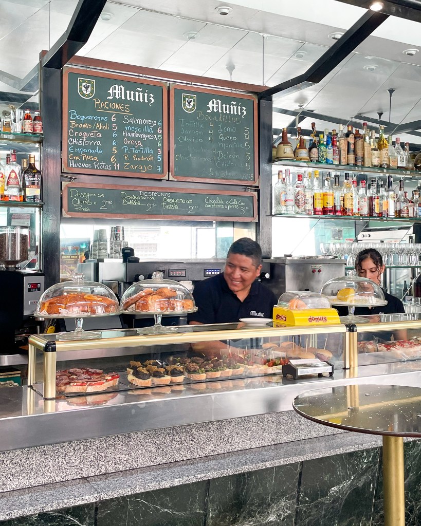 We didn’t really have much else planned for the morning, so I was just looking at google maps and found Bar Muñiz. I knew we immediately had to walk there! Muñiz is Brian’s last name (and mine too, yay newlyweds!) and it’s not super common in the States. Bar Muñiz was a super small local bar. We took a quick break here for some coffee and, you guessed it, churros!