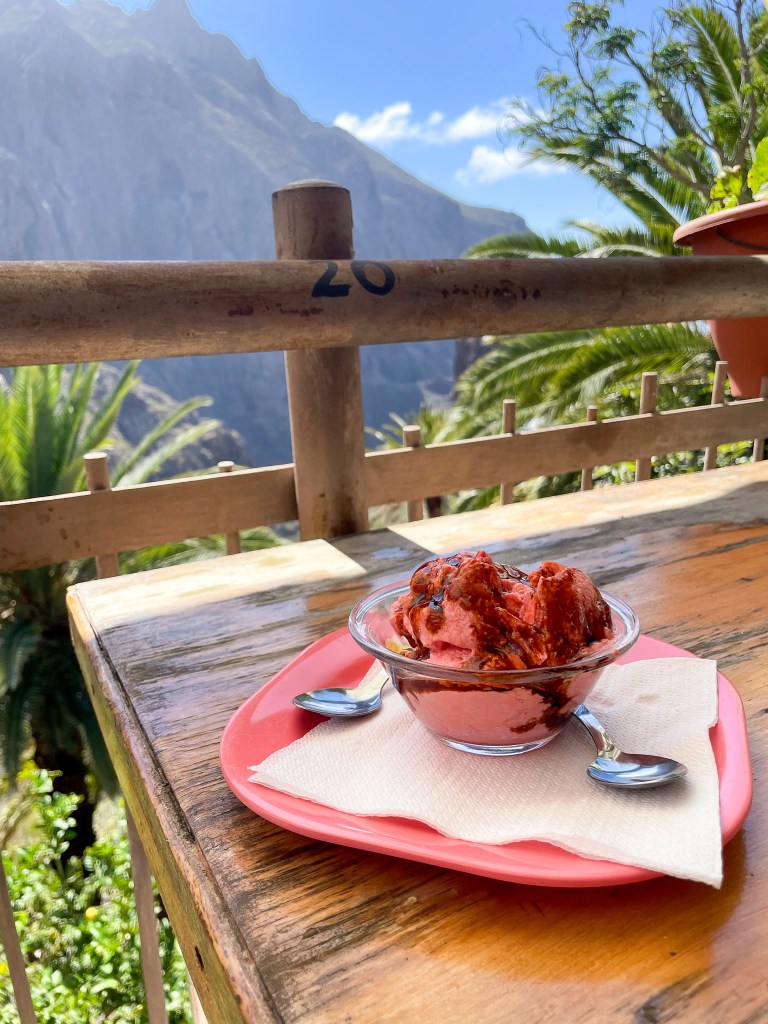 From Bar Blanky, we walked to Fuego for more drinks and cactus ice cream. The cactus fruit is a big deal in Masca and you could get a bunch of cactus food and drink items from Fuego. Again, the views were incredible and we had a lovely time just sitting on the patio, resting, drinking, and soaking it all in.
