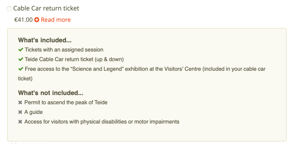 Buying tickets online is weird and is very tricky to find what you need! VolcanoTeide.com definitely tries to get you to book a whole excursion and finding JUST cable car tickets is very difficult. However, after looking at the website for a long time, we finally realized that even when you click on “cable car only,” they list all their products and start with you choosing your “pick up location” (which is for excursions only).