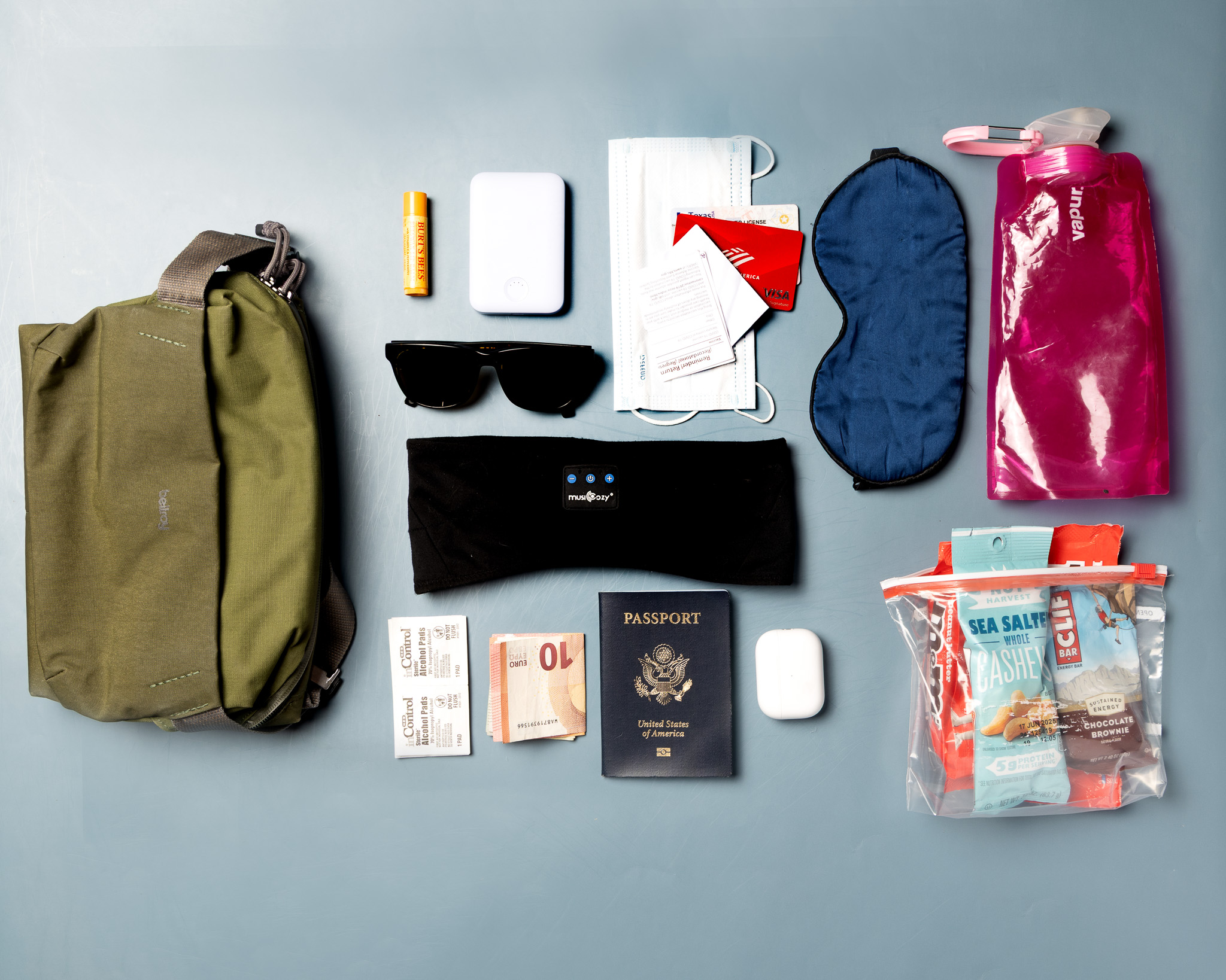 - Hidden inside: alcohol wipes for nausea, phone info, copies of passport/ID, mask (I bring a mask with me when I travel now, not to prevent illness but to help with the dryness of the airplane air! If you’ve got a cough, the dry airplane air is going to make you cough 100000 times more. Wearing a mask can help stop that!)